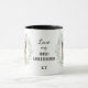 "J'AIME MON IRISH WOLFHOUND" déclare cette tasse pour le propriétaire de chien Wolfhound. Chaque côté de la tasse comporte un portrait d'un Irish Wolfhound gris et blanc encadré par des feuilles d'eucalyptus vertes tendres à l'aquarelle. Entre les deux images se trouve le texte, qui peut être facilement personnalisé, ou même supprimé par vous, et votre monogramme ou nom.