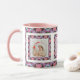 Coutume Jolly Rose Automne Hiver Noël Motif Photo Tea Coffee Mug. Dans les couleurs automnales traditionnelles de rose muet, rouge foncé, bleu glacé et vert ; dans un joyeux multicolore, maximaliste, moderne motif géométrique. Pour des boissons chaudes en hiver et un chocolat chaud gai lors de nuits d'hiver agréables. Changez les trois photos en photos pour célébrer des souvenirs de famille joyeux. Achetez comme un cadeau de table de souvenir festif pour elle, les mères, les épouses ou les grands-parents.