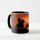 Un cow-boy corde un bâton grincheux au coucher du soleil. Une tasse à café très cool dans l'ouest du ranch.