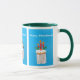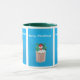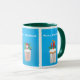 Une tasse à rondelle blanche festive avec jante et poignée verte sainte et "Joyeux Noël" en lettres blanches sur trois panneaux bleu vif, contenant des cupcakes. Les cupcakes sont recouverts d'un gel blanc et sont surmontés d'un bonhomme de neige, d'un robin et de trois bougies rouges.