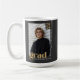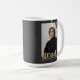Design a modern graduation keepsake mug for your graduate. Features bold typography and a fresh layout. Personalize with a photo, year, name, and school. Design repeats automatically on the other side of the mug. Shown in trendy charcoal, gray, and white, though all colors are editable. © Kimbellished, LLC