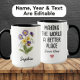 Honor the incredible woman born in February with this elegant custom mug featuring her birth month flowers—a mix of violet, primrose, pansy, and snowdrop. One side displays her name beneath a timeless floral illustration, while the other side reads: “Making the world a better place since [year].”