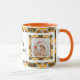 Custom Jolly Automne Hiver Noël Motif Photo Tea Coffee Mug. Dans les couleurs automnales traditionnelles d'orange vif, de vert et de gris ; dans un joli motif géométrique multicolore et maximaliste. Pour des boissons chaudes en hiver et un chocolat chaud gai lors de nuits d'hiver agréables. Changez les deux photos en photos pour célébrer les souvenirs de famille. Modifiez le texte au milieu de votre salutation festive. Achetez comme un cadeau de table de gardien de fêtes pour elle, maman, maman, mère, ou même grand-mère.
