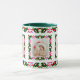 Custom Jolly Noël Motif Photo Photo Tea Coffee Mug. Dans les couleurs traditionnelles du rouge et du vert, avec des touches de violet chaud et d'orange vif ; dans un joli multicolore, motif maximaliste. Pour des boissons chaudes en hiver et un chocolat chaud gai lors de nuits douillettes en hiver. Changez les trois photos en vos propres photos pour célébrer les souvenirs de famille. Achetez comme un cadeau de table de gardien de fête à petit prix pour elle ou ses grands-parents.