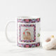 Coutume Jolly Rose Automne Hiver Noël Motif Photo Tea Coffee Mug. Dans les couleurs automnales traditionnelles de rose muet, rouge foncé, bleu glacé et vert ; dans un joyeux multicolore, maximaliste, moderne motif géométrique. Pour des boissons chaudes en hiver et un chocolat chaud gai lors de nuits d'hiver agréables. Changez les deux photos en photos, et personnalisez le texte, pour célébrer des souvenirs de famille joyeux. Achetez comme un cadeau de table de souvenir festif pour elle, les mères, les épouses ou les grands-parents.