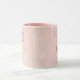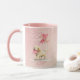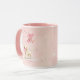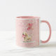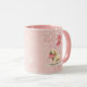 Happy Valentine's Day romantic mug with a personalized message and a dog illustration with heart balloons. Pink background design.