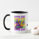 Stylish MARDI GRAS Top Hat Feathers Coffee Mug in the popular colors of purple, gold and green. The design shows a large Mardi Gras top hat with feathers and theater masks. The phrase MARDI GRAS is repeated in the same colors in the background in bold typography. Ideal Mardi Gras drinkware when taking a cuppa in Louisiana, New Orleans, Brazil, and anywhere Mardi Gras is celebrated. Matching gifts available.