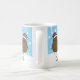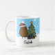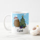 A cute Christmas personalized mug featuring a cartoon potato in a whimsical Christmas scene. The potato is in front of a Christmas tree that has lights attached and a star on top. Ideal for a holiday stocking filler or for your hot cocoa.
