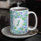 Cette mignonne tasse à café d'art grenouille a un monogramme et dessiné à la main grenouilles vertes avec des nénuphars verts, bleus et violets sur un arrière - plan bleu clair. Customisez la conception en modifiant la première pour la personnaliser. C'est un design chic de poutres qui sera un joli complément à votre routine de café du matin. Idéal pour les amateurs d'amphibiens !