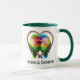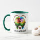 Célébrez le couple inséparable avec cette tasse, qui présente une paire d'oiseaux de l'amour colorés générée par l'IA qui se blottit dans une touffe en forme de coeur. Personnalisez avec des noms. Reverse affiche un design identique. Un cadeau d'anniversaire pour la Saint-Valentin, un mariage ou un mariage! Design © W.H. Sim. Voir plus sur zazzle.com/word2art