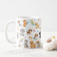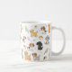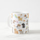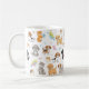 Cette adorable tasse en céramique blanche présente un motif joyeux et omniprésent de divers animaux de compagnie de dessins animés mignons. Le design comprend des illustrations ludiques de chiots (dont un beagle et un récupérateur d'or), des chatons, un caniche, un budgerigar et un cobaye. Le motif fantaisiste possède également de petits détails comme des empreintes de pattes, des papillons et des poissons, ce qui en fait un cadeau parfait pour tout amoureux des animaux ou amateur de familier.