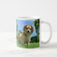 Fluffy puppy sitting in a lush green garden on a beautiful summer day.