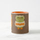 Buvez votre café fraîchement moulu dans un style rétro avec cette tasse à café personnalisée qui présente de mignons illustrations de style vintage de chouettes en orange, crème et vert avocat dressé contre un arrière - plan marron.