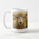 A cute coffee mug with a cute ewe with an adorable impasto style sheep on an old rustic farm looking at you and on the back it says, "Ewe, People"