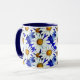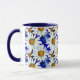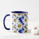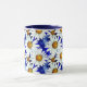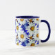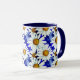 Tasse avec un motif aquarelle de marguerites blanches aux centres jaune doré, sur un fond aux nuances de bleu denim
