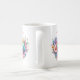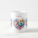 A mug with a beautiful illustration. A heart-shaped bouquet of flowers in pastel blue, green, purple and yellow. With a lovely blue butterfly hovering in front.