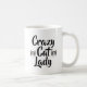 Fun chat tasse. En lettres noires sont les mots Crazy Cat Lady. De chaque côté de la lettre est une tête de chat gris et blanc, avec des points pour les yeux et les oreilles roses.