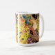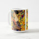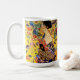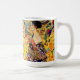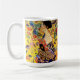 Mug de café avec peinture à l’huile de Gustav Klimt Lady with Fan (1918). Une femme portant un kimono bleu tient un ventilateur rouge contre un arrière - plan jaune coloré de fleurs et de paons. Un grand cadeau pour les amateurs de Japonisme et d'art européen.