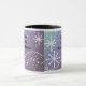 Une jolie tasse de vacances avec des flocons de neige blancs dansants sur un arrière - plan bleu chatoyant et mauve.