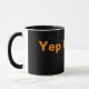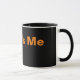 Tasse à café noir avec texte orange.