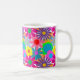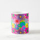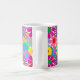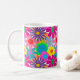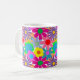 Cette tasse a un design des années 1970 de fleurs dans différentes couleurs.