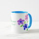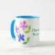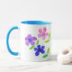 Une tasse à café blanc chic avec lèvre et poignée bleue, décorée avec un motif floral, d'un collage en papier peint à la main par Judy Adamson.