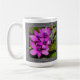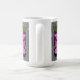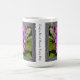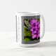Commencez la journée en beauté avec une tasse à café contenant un message inspirant et des photos de fleurs de babouins magenta entourées de bordures de motifs uniques trouvés dans l'écorce d'arbre.