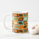 Cette tasse présente un design moderne du milieu du siècle, avec des rectangles arrondis inclinés sur le côté, des rectangles inclinés à l'intérieur, faits de lignes toutes dans les couleurs des années 1970.