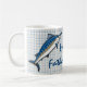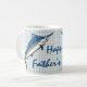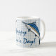 Peu de poissons sont incroyablement beaux que le marlin bleu — et peu de poissons sont plus gros. Le marlin bleu est le plus grand des marlins de l'Atlantique et, sérieusement, l'un des plus gros poissons du monde. Comme pour certaines espèces, la femelle est souvent un peu plus grande que le mâle. Les femelles peuvent atteindre 14 pieds de long et peser plus de 1900 livres, mais la moyenne tourne autour de 11 pieds de long et 300 livres. Un bleu profond sur le dessus et un blanc argenté en dessous, avec une nageoire dorsale prononcée et une longue mâchoire supérieure létale en forme de lance (que certains appellent un bec), les marlins bleus sont l'un des poissons les plus facilement identifiables et reconnaissables au monde. Les marlins sont réputés pour leur endurance incroyable dans une lutte lorsqu'ils sont accro, ce qui en fait un favori des pêcheurs de gros gibier. Bien qu'on puisse aussi parler de n'importe quel super gros poisson, je ne peux pas imaginer qu'il y ait beaucoup plus excitant pour le pêcheur avide que d'accrocher un de ces géants et de le voir casser l'eau dans la lutte. Cette conception rend hommage plus à ce poisson majestueux qu'aux pêcheurs qui le recherchent. Pour cette merveilleuse tasse de café, deux marlins encadrent un élément texte, "Happy Fête des pères". Évidemment, un excellent choix pour la Fête des pères, vous êtes invités à modifier le texte pour mieux convenir à votre célébration pour votre pêcheur préféré.