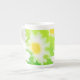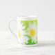 Une jolie tasse de porcelaine en os fleurie avec un motif de fleur marguerite blanche contre un arrière - plan vert vif.