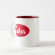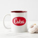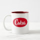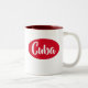 Une tasse rouge et blanche qui dit "Cuba" dessus. Un design simple et sympathique qui se démarque de loin.