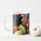 Photographie d'une variété de fruits délicieux et colorés imprimés des deux côtés de la tasse.