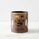 Un visage et des roues de médecine sur une tasse. Les couleurs sont rouge, jaune, noir, blanc, or et marron. Linda LaBow Wagner travaille sous copyright.