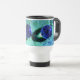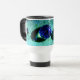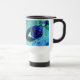 Des gouttelettes d'eau sur une feuille après la pluie se sont aliénées en bleu. Une photographie macro-nature des chutes de pluie par Katho Menden. Cette tasse de voyage est une idée cadeau pour les amoureux de la nature. http://www.zazzle.com/kathom_photo