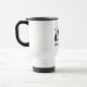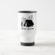 Mug de voyage personnalisé pour un joyeux camper! Le design a doodle art, silhouette de dessin de tente de camping dans les bois avec des pins sous la lune et les étoiles. Le design est personnalisé avec votre nom, écrit dans un script de brosse décontracté.