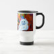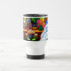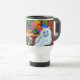 Travel Mug mettant en vedette la peinture animale de Louis Wain Master of Cat College (1860-1939). Un chat blanc réfléchi aux yeux bleus saisissants se tient à côté d'un assortiment vibrant de belles fleurs. Le majestueux collège de chats se dresse dans l'arrière - plan sous un ciel rose et bleu. Un cadeau merveilleux pour l'art amoureux des chats et anglais.