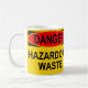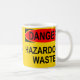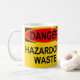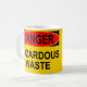 Un regard amusant sur le café du bureau. Arrière - plan jaune vif avec le mot Danger en haut dans un ovale rouge. Déchets dangereux au fond en noir.