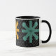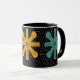 Cette tasse a un design moderne du milieu du siècle des étoiles en couleurs rétro sur un champ de noir.