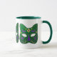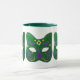 Cette tasse insolite présente un design fabuleux basé sur un masque de chat vénitien dans les couleurs traditionnelles Mardi Gras.
