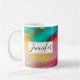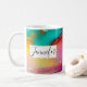 Tasse à café personnalisée avec un design abstrait artistique sophistiqué. Peinture aquarelle avec les couleurs mélangeant et mélangeant créant un motif marbré fluide. Un cadre blanc avec une fausse bordure en feuille d'or superposée avec votre texte personnalisé écrit à l'intérieur.