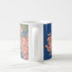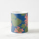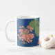 Une tasse blanche avec un design sérigraphié de géraniums rose saumon
