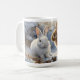 De mignons lapins bruns et blancs assis dans la neige sur cette tasse de café (chocolat chaud, cacao chaud, thé).