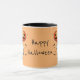 Boo ! Parfait pour votre Bassin d'Halloween ! Cette Mug d'Halloween Whimsical présente un joli fantôme Éffrayant. D'une part, il tient un ballon Citrouille et de l'autre un Jack-o-lanterne. Les chauves-souris remplissent le ciel nocturne. Le Verset dit : "Heureux Halloween." Personnalisez cette mignonne tasse d'Halloween à votre contenu de coeur!
