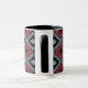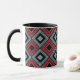 Cette tasse a un design art déco de formes diamant avec des lignes diagonales, des diamants noirs et des diamants colorés dans les tons bleu et canneberge.