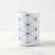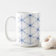 Blue snowflakes in a diamond pattern on a white background. The snowflakes started as a photograph taken in 1909 of individual snowflake crystal. The subtle pattern is great for any winter holiday.