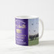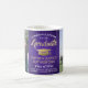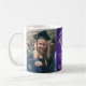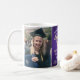 Célébrez la réussite du diplômé avec cette tasse à café personnalisée avec 2 photos, violette, or et blanche. Les images et le texte sont faciles à personnaliser. Incluez votre citation inspirante préférée, devise motivante, nom de l'école et diplôme, félicitations, merci maman et papa, ou tout autre message de votre choix. Le design présente un fond violet en faux acier brossé, un chapeau de diplômé en faux foil, une typographie moderne personnalisée avec le nom, l'école et l'année de promotion, ainsi que deux photos de votre choix, telles que des photos de fin d'études ou des images de la cérémonie de remise des diplômes. Veuillez noter que la couleur or est une couleur imprimée, et non une feuille métallique. Cadeau souvenir attentionné et ajout élégant à la décoration de la maison. Félicitations au diplômé