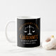 Cette tasse à café de fin d'études de droit noir personnalisée présente une typographie orange pour une classe de 2024 diplômée. Customisez avec votre année de graduation sous les échelles de la justice pour un grand cadeau d'avocat commémoratif personnalisé pour leur collège ou université.