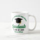 Cette tasse moderne verte et noire personnalisée pour les diplômés de deuxième cycle comprend votre nom de lycée ou de collège pour la classe de 2023. Customisez avec votre année de graduation sous le script manuscrit chic et le casquette noir grad pour une grande fête de graduation personnalisée faveur cadeau.