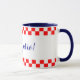 Cette tasse combo bleu marine présente un bonjour croate saluant "Dobro jutro !" avec deux rangées de dames rouges et blanches sur le dessus et le bas. Le texte est dans une belle police de calligraphie bleue qui correspond à la couleur de la bande inférieure du drapeau croate.