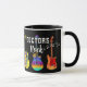 Célébrez vos amis médecins ou votre famille s'ils sont diplômés de leurs diplômes médicaux ou simplement faire un excellent travail avec cette tasse à café Doctors Rock avec des guitares psychédéliques colorées cool et la typographie moderne rock and roll. Guitares électriques uniques et guitare acoustique illustrations détaillées en bleu vif rose violet vert jaune et orange sur un arrière - plan noir. OEuvre originale de l'artiste Catherine Sweetman
